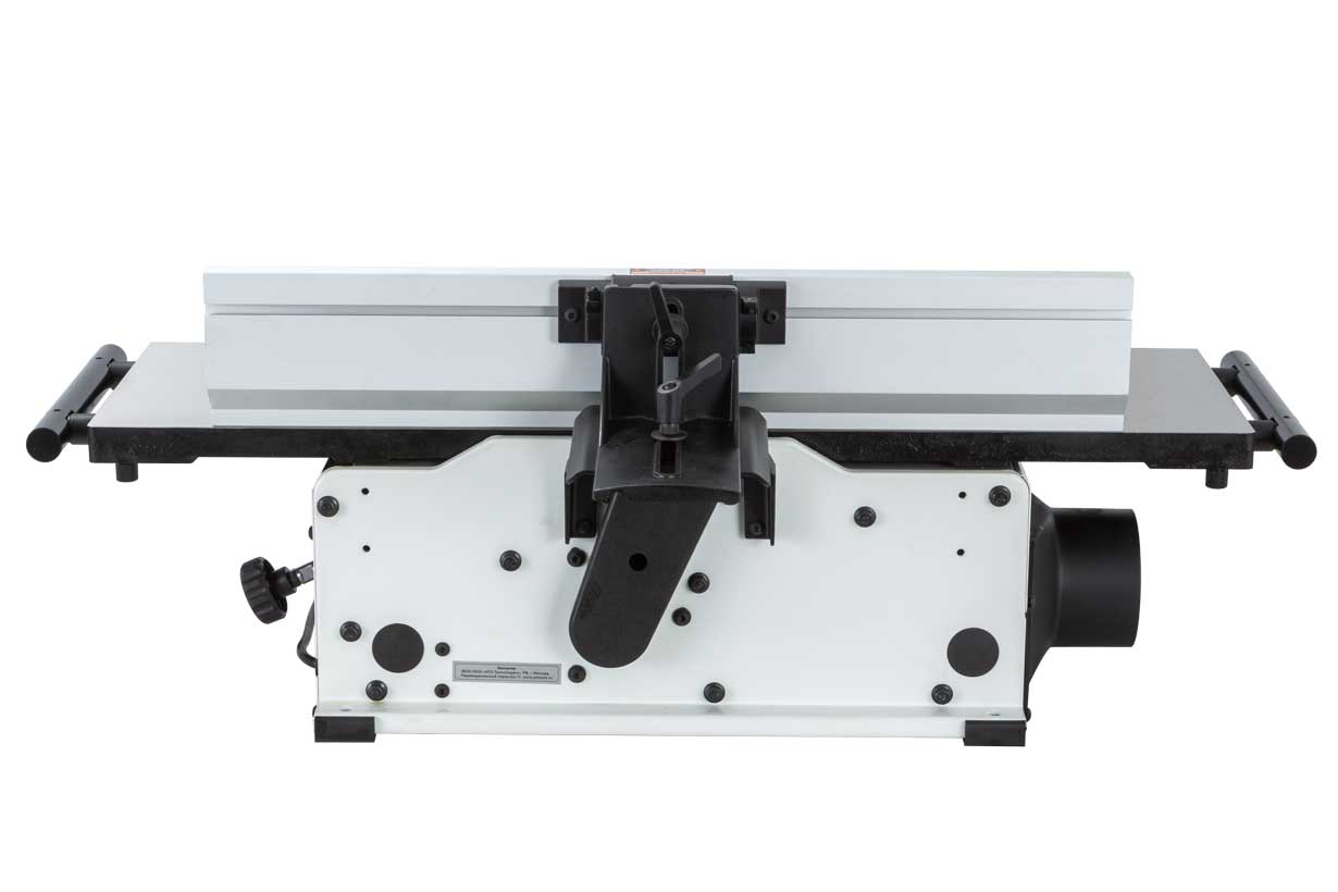 Как и у старших моделей, появилась возможность регулировки подающего и принимающего столов. И не только по высоте, но и по плоскости. А параллельный упор, изготовленный из экструдированного алюминия, имеет небольшой вылет и дополнительно может быть зафиксирован опционально поставляемыми кронштейнами для усиления жёсткости при фуговании тяжёлых длинных заготовок.
