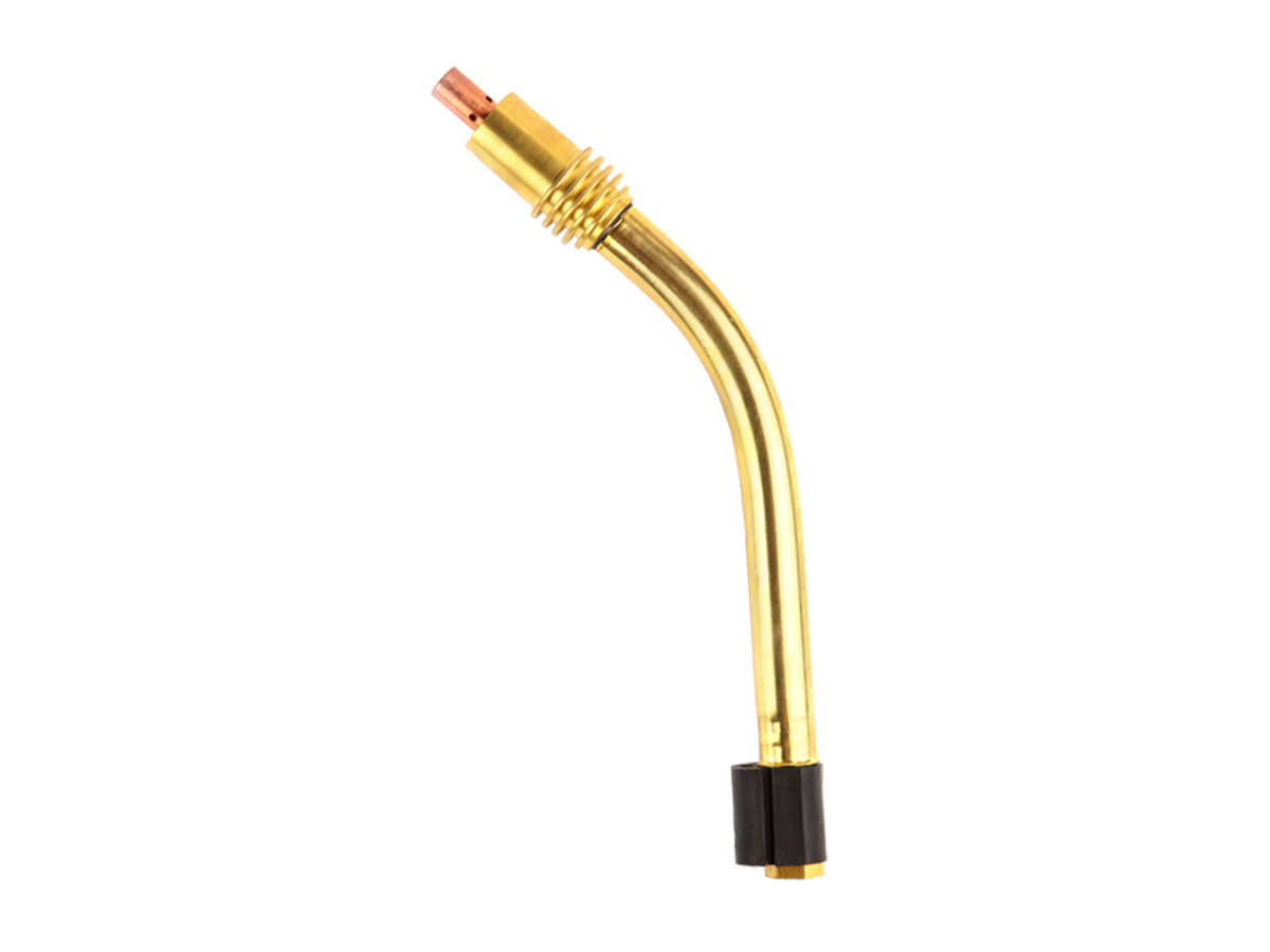 Имеет изогнутую форму, что обеспечивает более удобное использование во время работы. Гусак нужен для того, чтобы закрепить на горелке держатель наконечника и газораспределитель, а также для подачи в зону сварки электрического тока и защитного газа. Крепится к рукоятке горелки с помощью резьбового соединения.